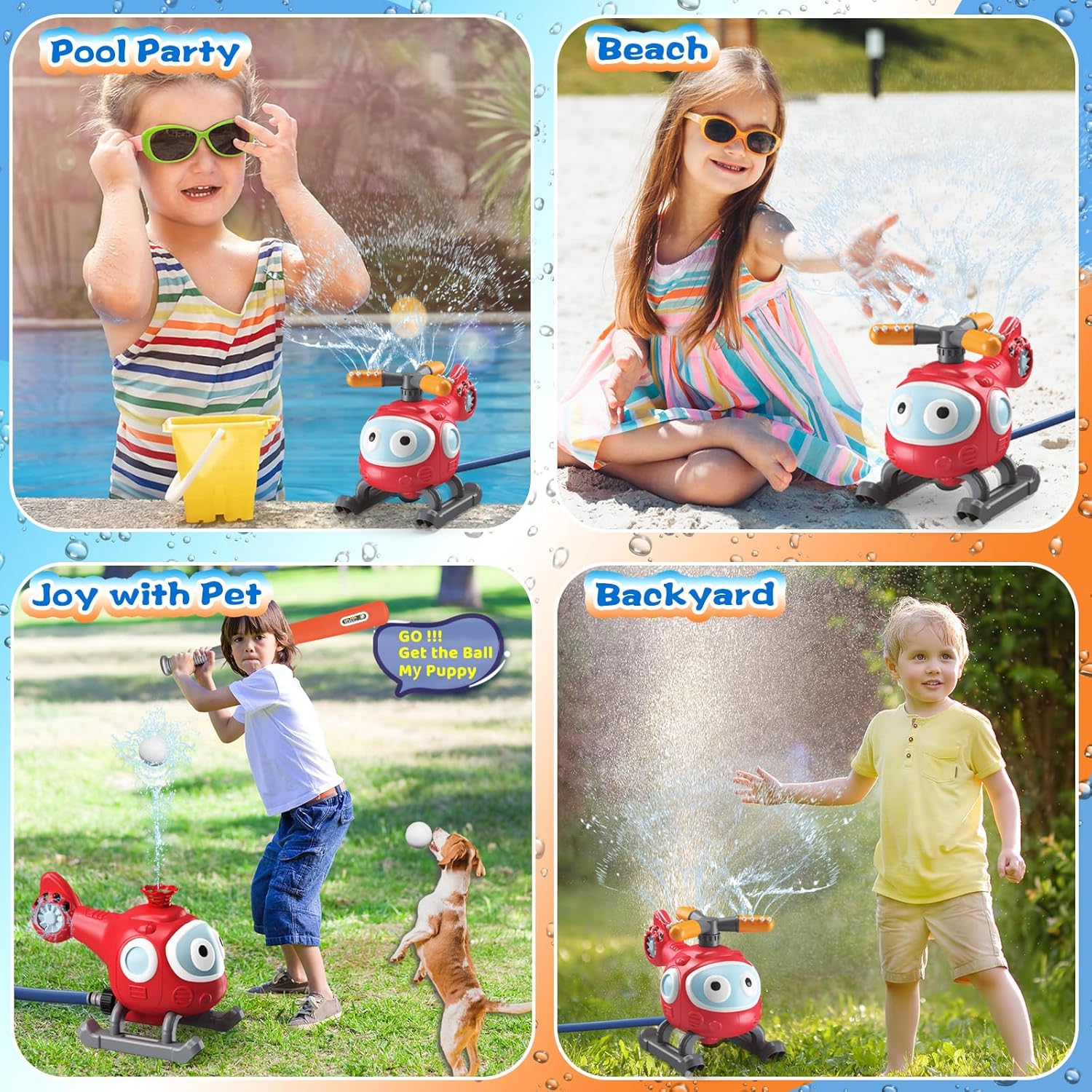 Water Sprinkler for Kids: This helicopter sprinkler sprays cool water through 12 nozzles and the sprinkler heads could be rotated 45°. By adjusting angle to control the water spray height and width, your kids and pets will love the great surge of water from the 360° rotating waving tubes. How a funny water toy for kids, as well a great sprinkler to water your garden and lawn