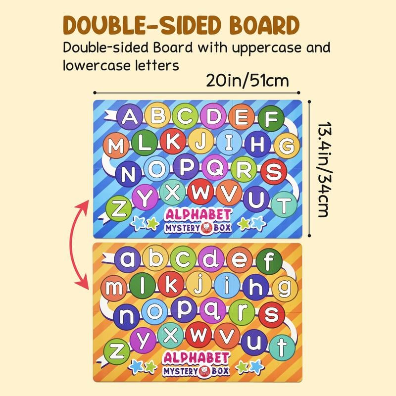 BLIND BOX ALPHABET MATCHING GAME: Our letter matching game includes 1 mystery box, 26 mini figures, a double-sided game board with upper and lower case letters, and a timer hourglass. Children can reach into the box to match the mini figures with the letters, enhancing their letter recognition and creating an exciting and surprising learning experience