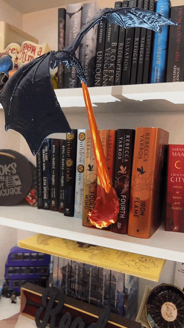 ✨🐉Add this unique, and one of a kind, dragon flame book Nook to your library/ book shelf, to add that special fantasy feel to your decor. It adds a remarkable look and feeling every time you look at it. The color is a gorgeous black with a blue iridescence. Thats made from a special silk PLA filament.Unleash the power and magic of fantasy right in your home with thisstunning Wall Mounted Fire Breathing Dragon!